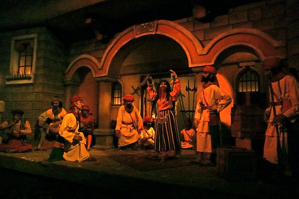Maar de Efteling kan het ook zonder woorden. Neem bijvoorbeeld de - overigens ontzettend oriëntalistische - Fata Morgana: een boottochtje door de ‘Verboden Stad’, geïnspireerd op Duizend-en-een-nacht. We zien armoedzaaiers, bedelaars en horen geruzie in een taal die Arabisch voor moet stellen. Dan varen we onveilig gebied in, het territorium van de sultan. Een hek valt dicht maar blijft net boven ons steken, een wachter schiet, maar mist. We zien slavenarbeid, martelingen en ter dood veroordeelden. Maar het was het allemaal waard, want we komen aan in het paleis vol edelstenen en buikdanseressen. We hebben het maar mooi overleefd.