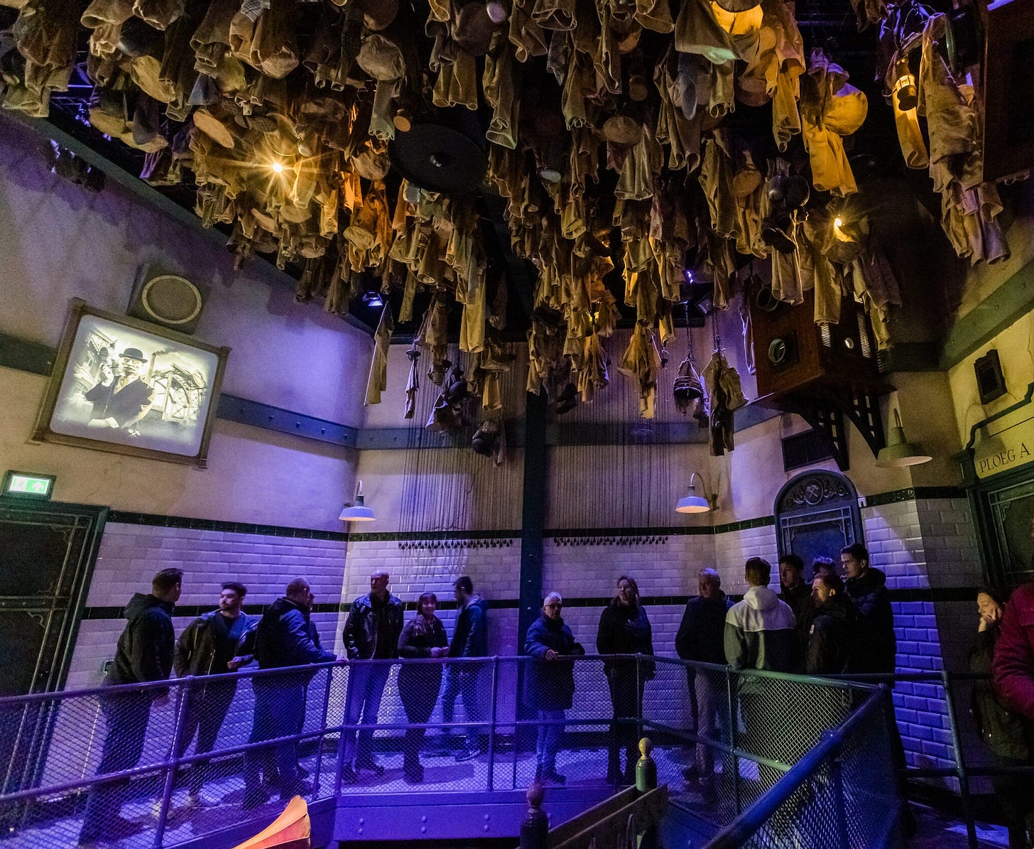 Eenmaal vastgeketend aan de beugel van het karretje rijden we naar een laatste ruimte waar de witte wieven, met dezelfde muziek, nog een keer de confrontatie aangaan. ‘We hebben u gewaarschuwd.’ De deuren gaan open, de kar wordt traag omhoog getakeld, de spanning die dit soort achtbanen eigen is wordt opgevoerd. Op 37 meter hoogte blijven we kort steken – sabotage door de spoken. In vrije val storten we naar beneden, de mijn in.